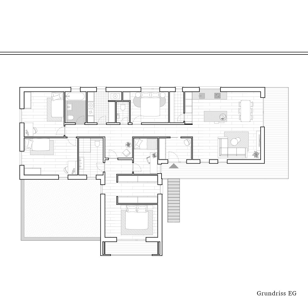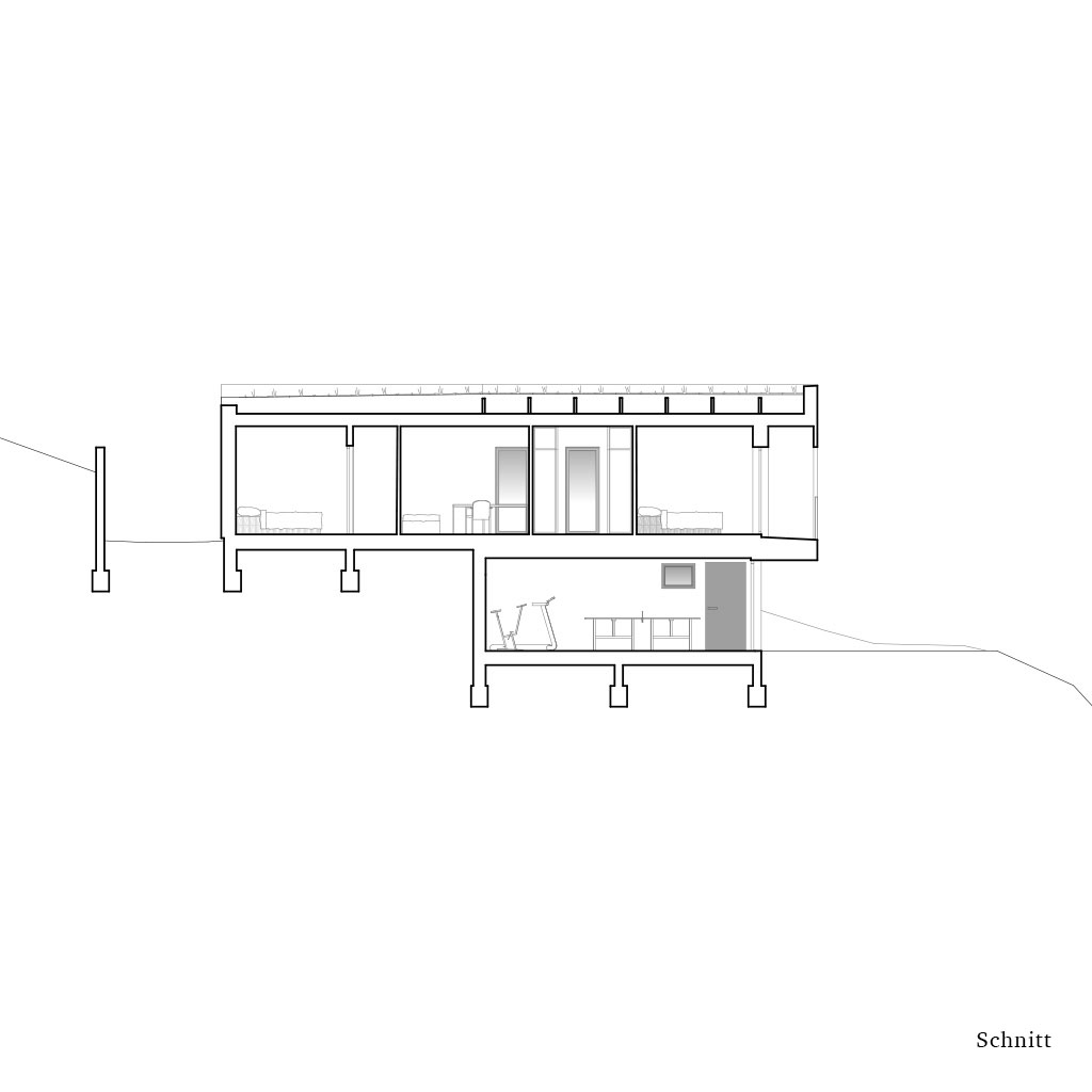 Der obere Teil des Hauses ist als Holzbau aus Sandwichpaneelen konzipiert. Der Grundriss des Gebäudes ist klar und einfach strukturiert. Durch die Lage des Haupteingangs in der Mitte des Hauses sind der Wohn- und Technikbereich im rechten Teil des Hauses klar definiert. Im linken Flügel befinden sich die Kinderzimmer. Der nach vorne ragende Trakt dient als Schlafzimmer mit großzügigem Ankleidezimmer und Arbeitszimmer.
