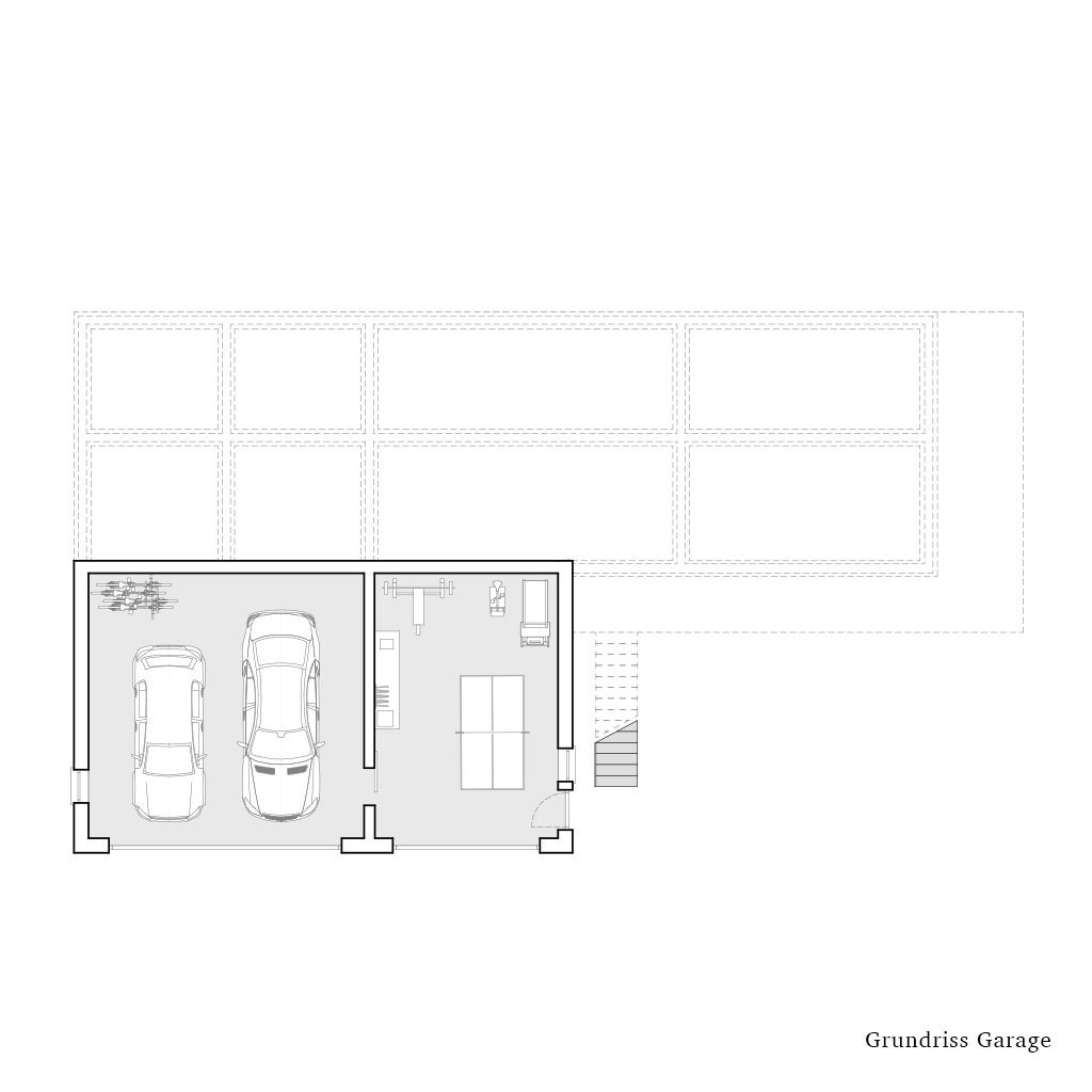 Im unteren Teil des Hauses aus Beton befinden sich eine Garage und ein großzügiger Hobbyraum, der sich leicht in eine zweite Garage umwandeln lässt. Das reichhaltige Parkplatzangebot entspricht dem Wunsch des Eigentümers, der ein Autoliebhaber ist.