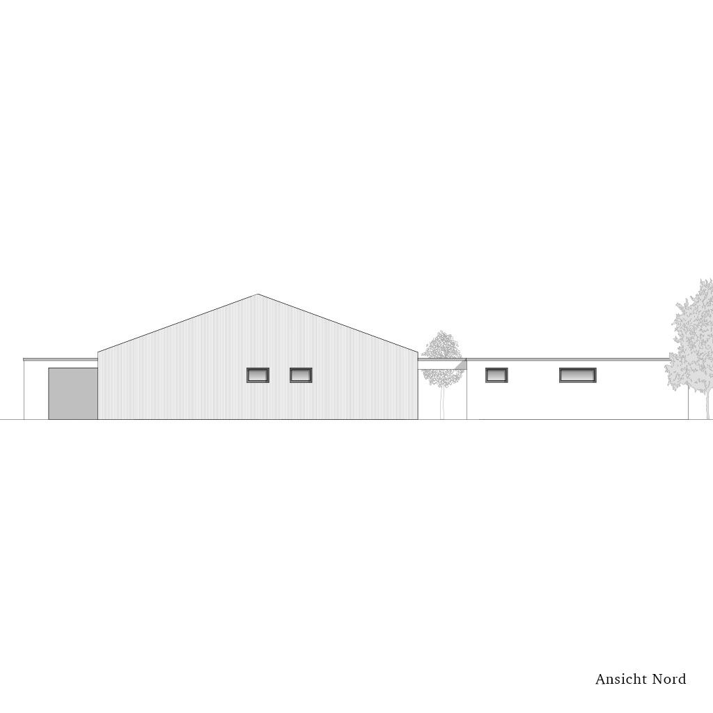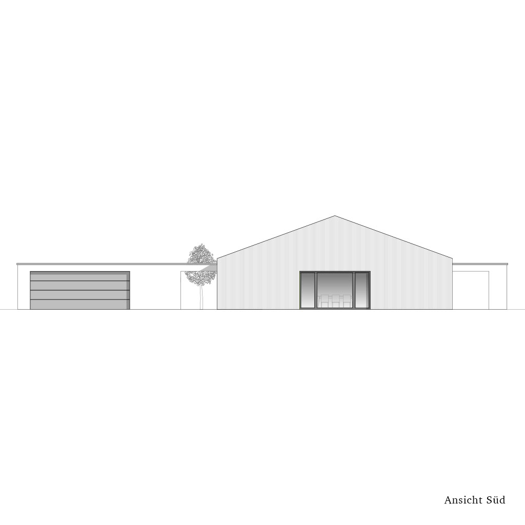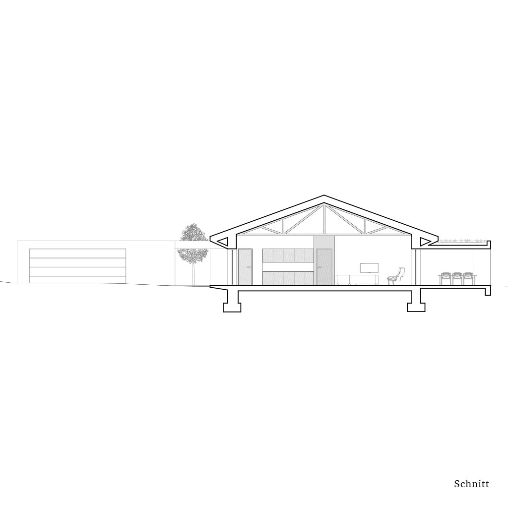 Der kompakte Grundriss wird von einem großzügigen Wohnbereich mit offenem Dachstuhl dominiert. Dieser ist nach Süden ausgerichtet und verfügt über ein großes Fenster in der Mitte der Fassade und der Achse des Innenflurs.