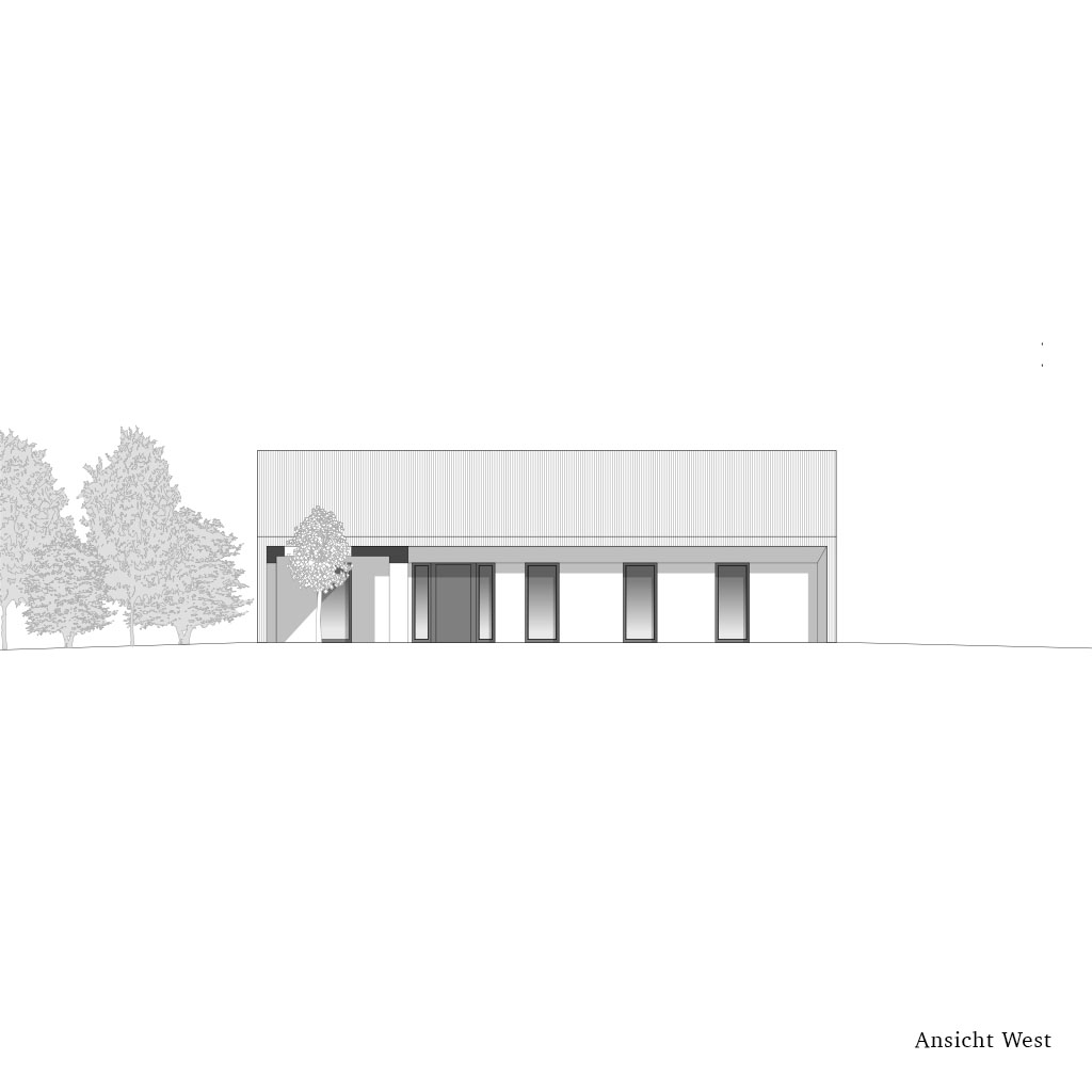 Der Eingang befindet sich auf der Westseite und ist so angelegt, dass er den Innenraum in einen Wohnbereich und einen Ruhebereich mit Schlafzimmern und anderen privaten Räumen unterteilt.